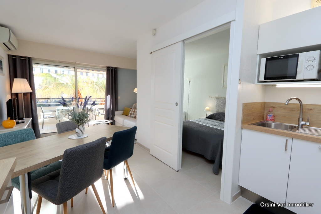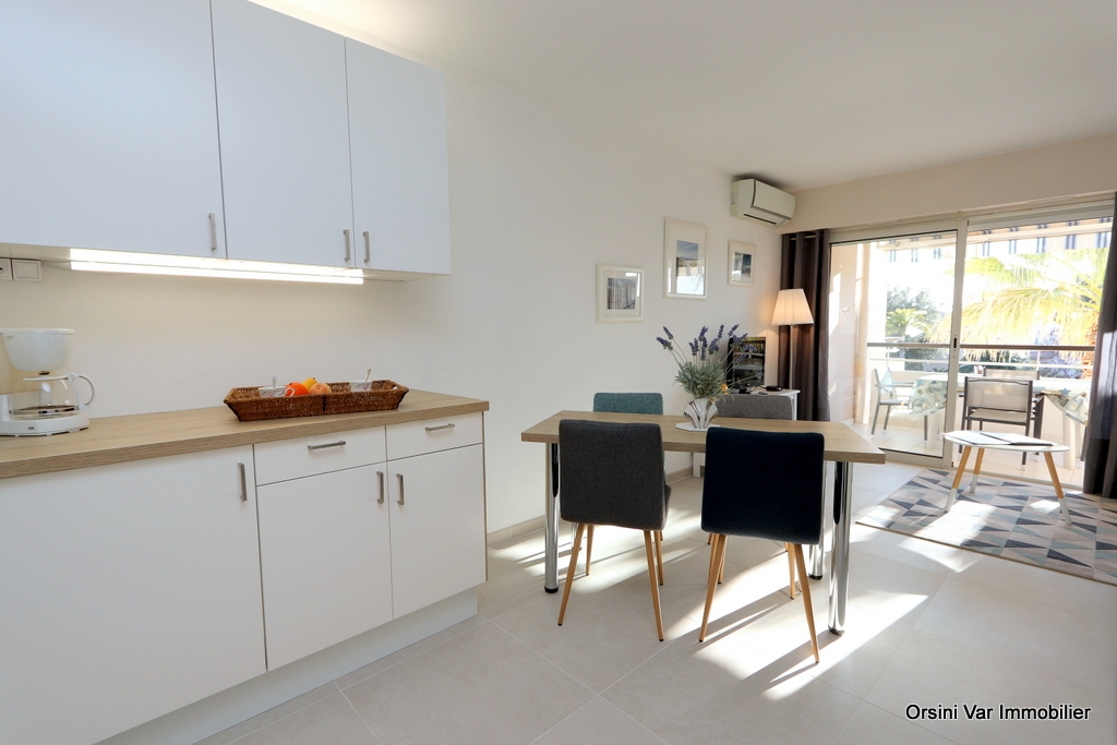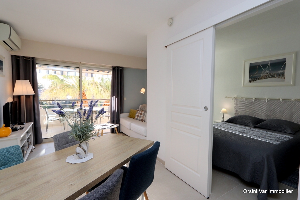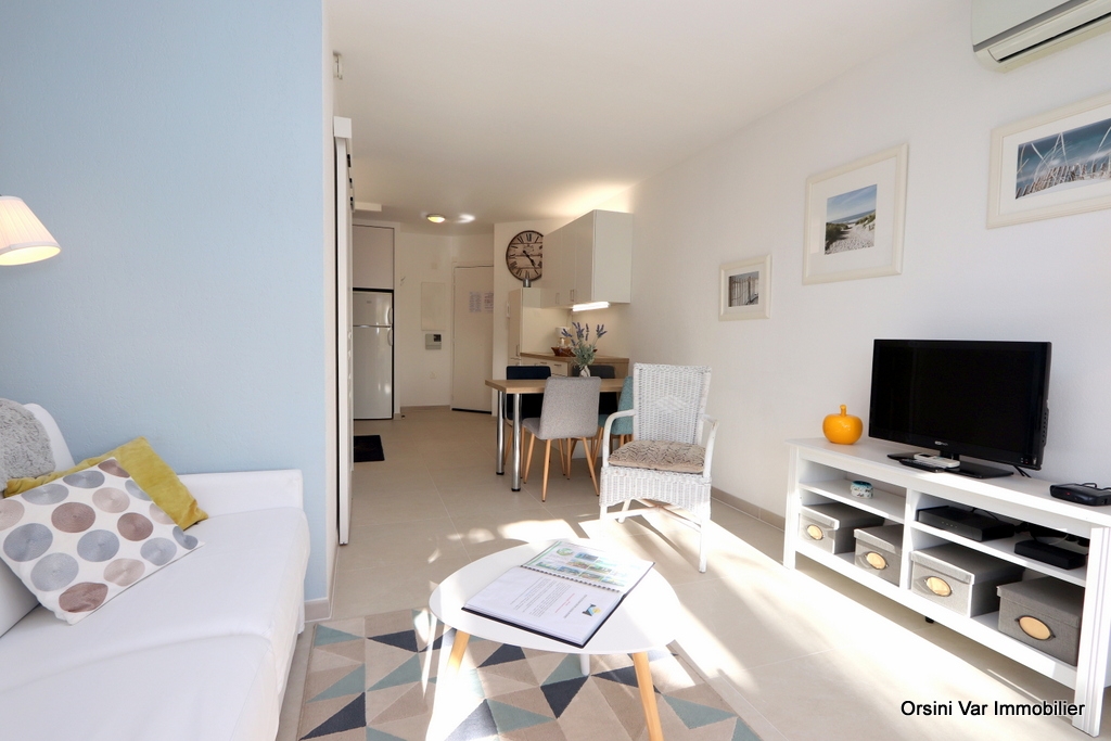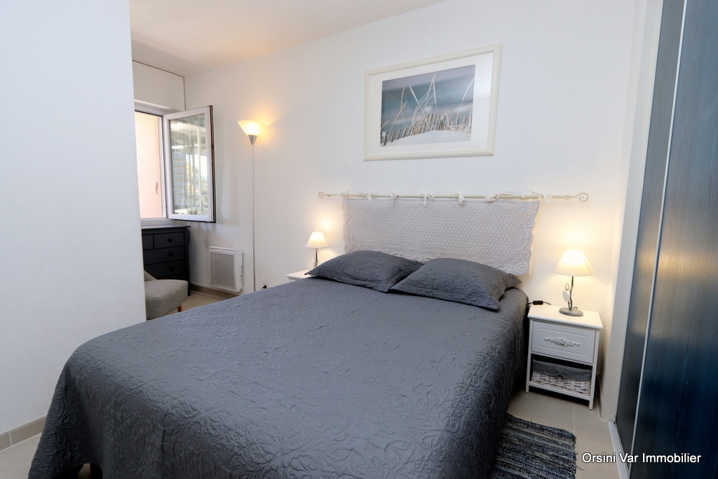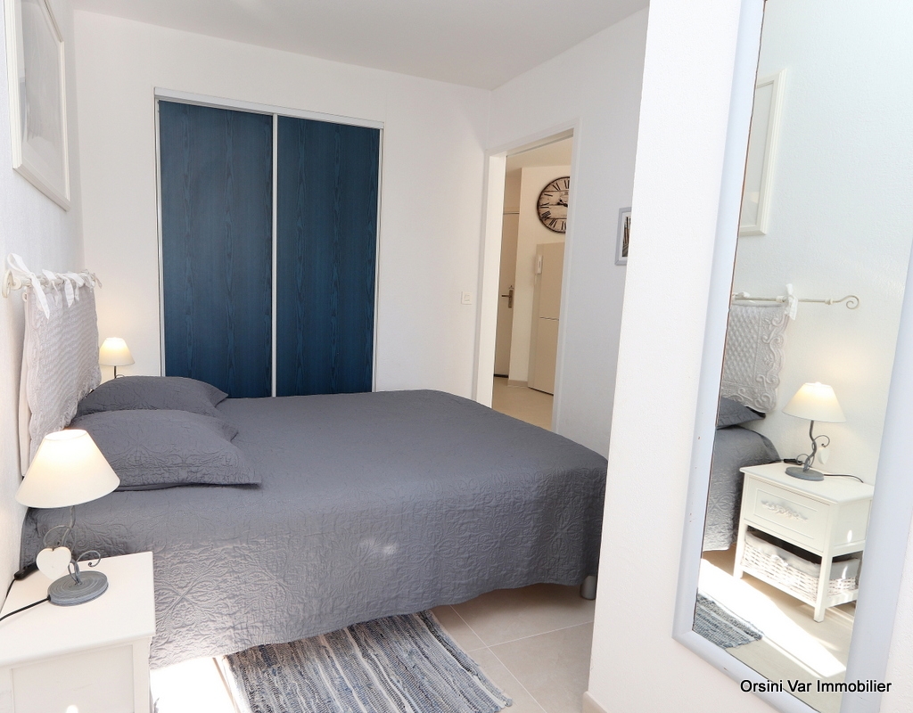 Al 2nd piano, esposizione Sud/Ovest con vista piscina, l'alloggio è composto d'un soggiorno (divano letto 2 persone) con angolo cottura attrezzato (piano cottura in vetroceramica 3 fuochi, forno, microonde, frigo/congelatore, lavatrice, lavastoviglie), d'una camera con letto matrimoniale (140×190), d'un bagno con grande doccia e WC.  Il soggiorno da accesso a una terrazzo di circa 10m² con mobili da giardino. TV, Wifi, Aria condizionata, Parcheggio, Piscina.