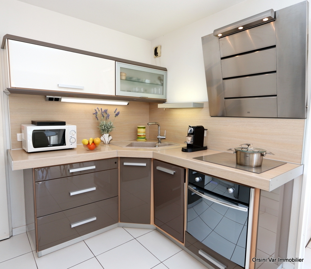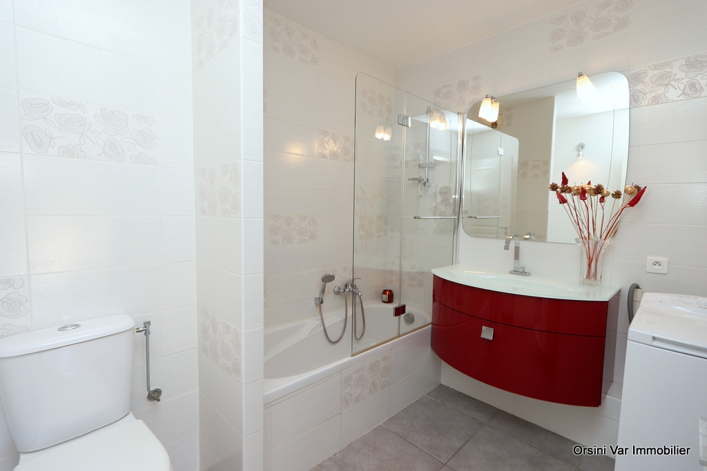 Al secondo piano, esposizione Est (alba), quest'alloggio è composto da un soggiorno (divano letto per 2 persone) con angolo cucina (piastre induzione 4 fuochi, forno tradizionale, micro-onde, frigorifero/congelatore, lavastoviglie), di una camera con letto matrimoniale (140×190), di un bagno con vasca da bagno, lavatrice e WC. Il soggiorno e la camera danno accesso al terrazzo di circa 15m ² con salone di giardino. TV, Wifi, Aria condizionata, parcheggio, piscina.