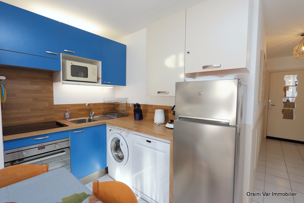 Al secondo piano, esposizione Sud/Ovest con vista piscina, quest'alloggio è composto da un soggiorno (divano letto 2 persone) con angolo cottura (piano cottura in vetroceramica 4 fuochi, forno, microonde, frigo/congelatore, lavatrice, lavastoviglie), d'una camera da letto con 2 letti singoli (90x200) e d'un bagno con doccia, bidet e WC. Il soggiorno e la camera danno accesso alla terrazza di 11m² con mobili da giardino. TV, Aria condizionata, WIFI, Parcheggio, Piscina.