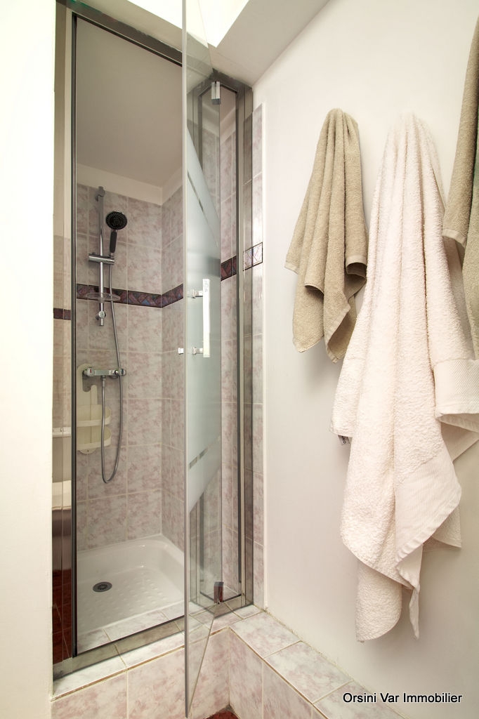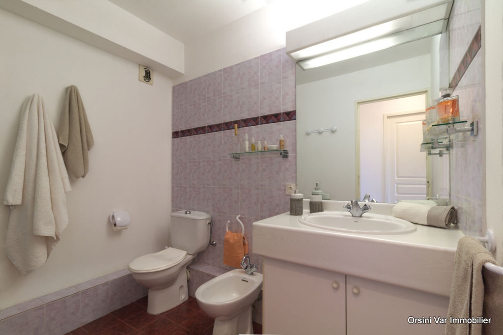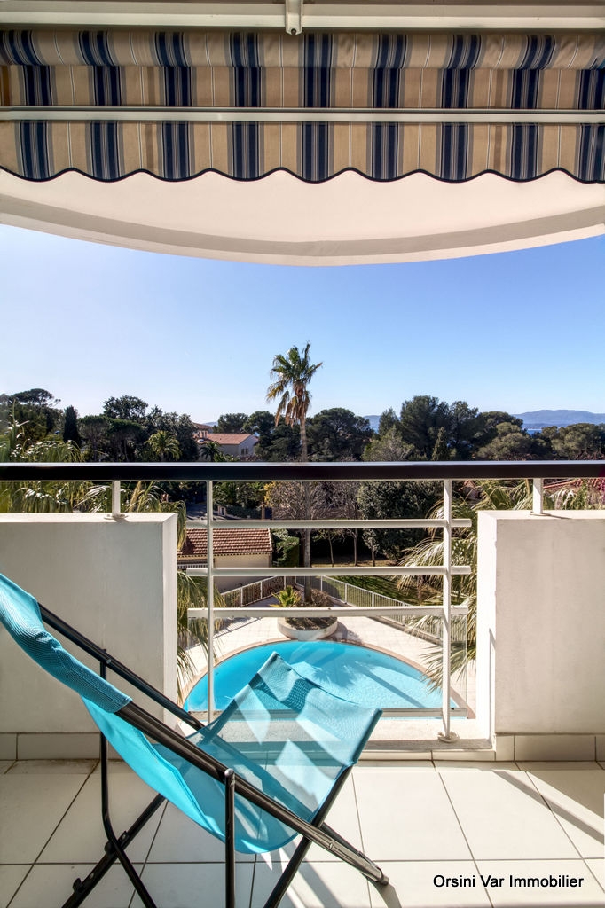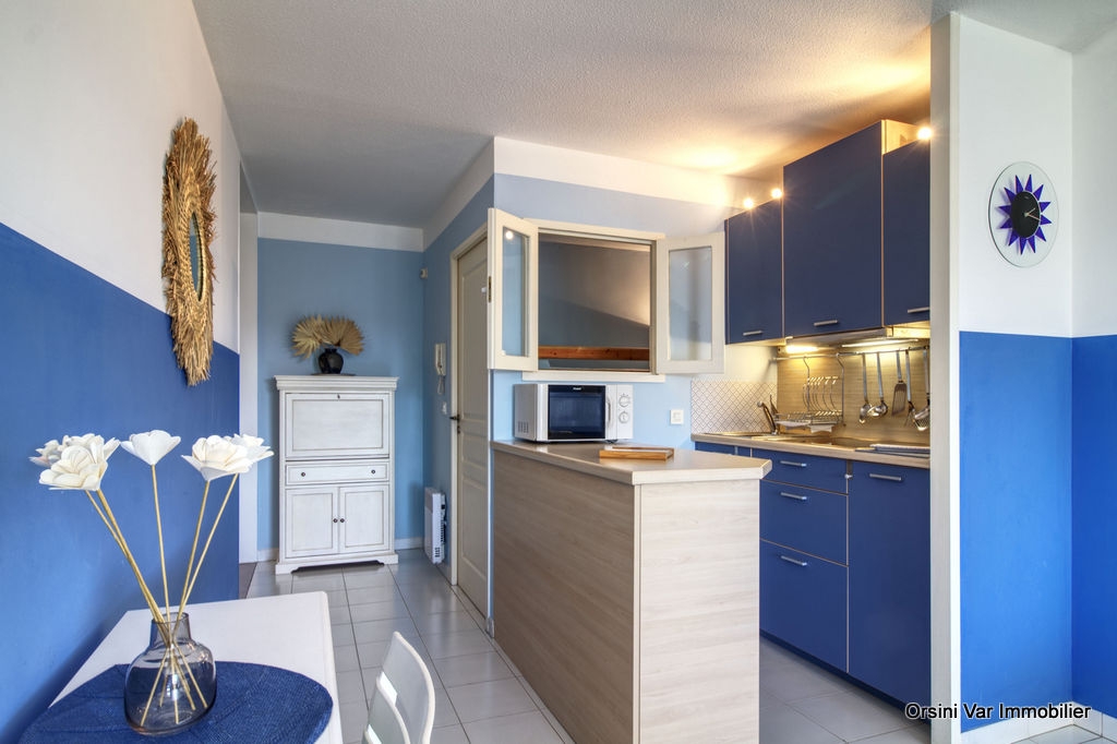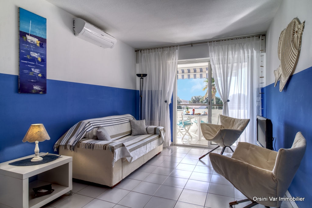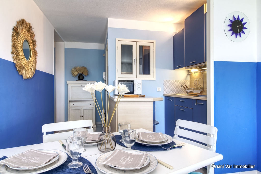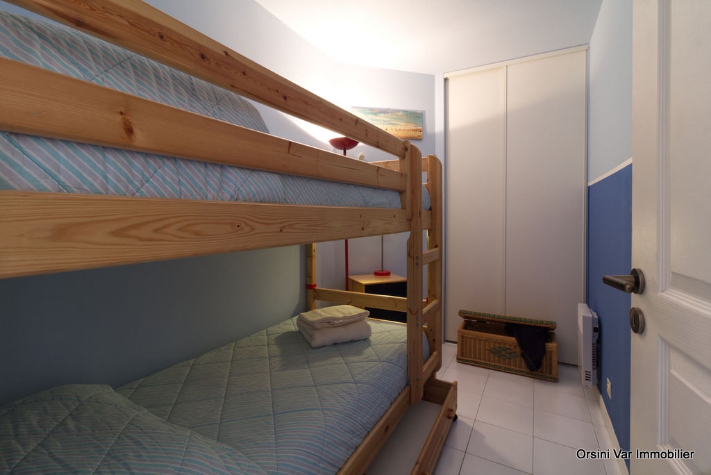 Al terzo piano, esposizione Sud/Ovest con vista piscina e piccola vista mare, quest'alloggio è composto da un soggiorno con cucina (piastre ceramica 4 fuochi, microonde, piccolo frigorigero congelatore), una camera con letto matrimoniale (160x190), una "cabina" con 2 letti singoli a castello, un bagno con doccia, WC e lavatrice. Il soggiorno e la camera danno accesso ad una grande terrazza di 12m² con mobili da giardino. TV, Aria Condizionata, Box privato (L 2.50m x H 1.80m x P 5m), Piscina.